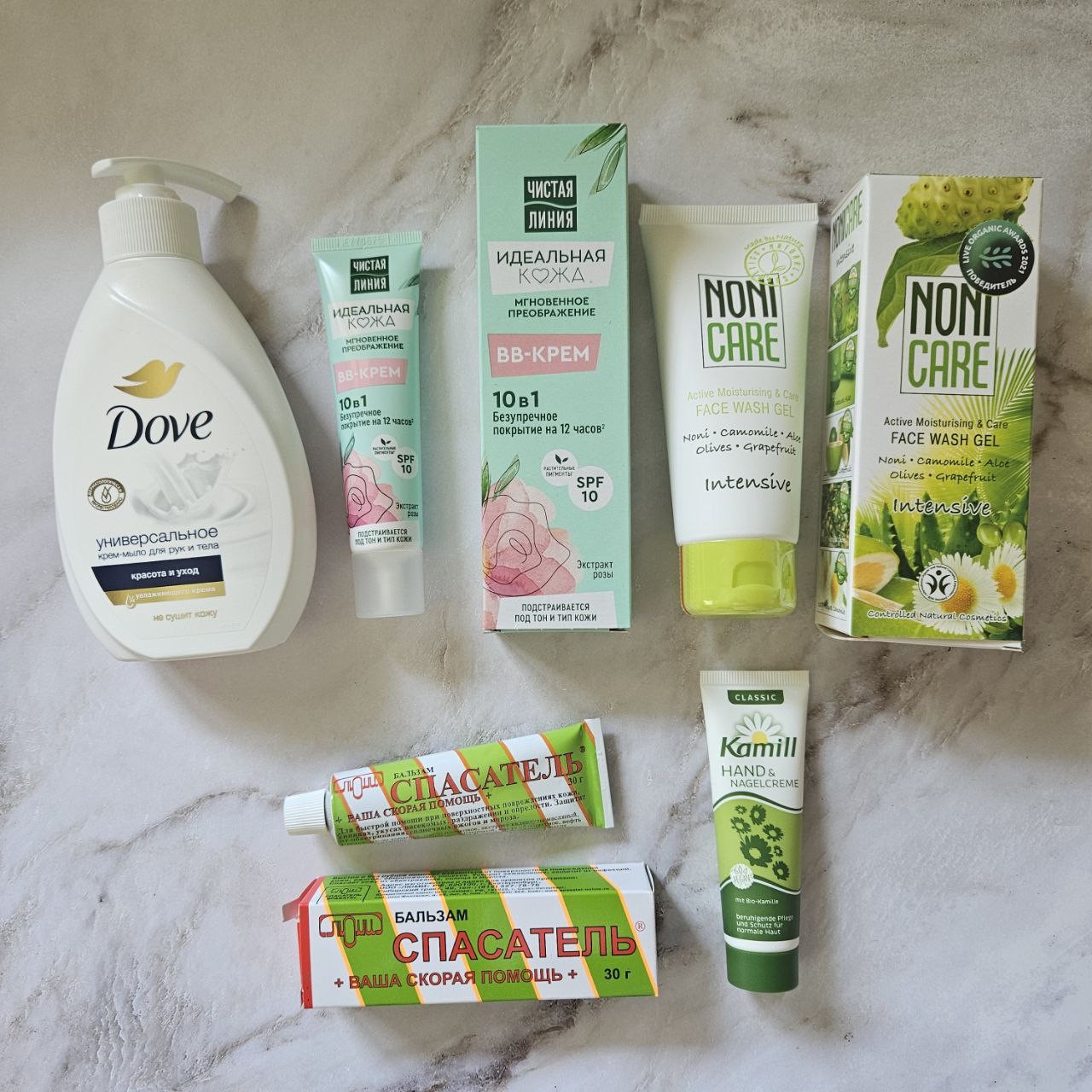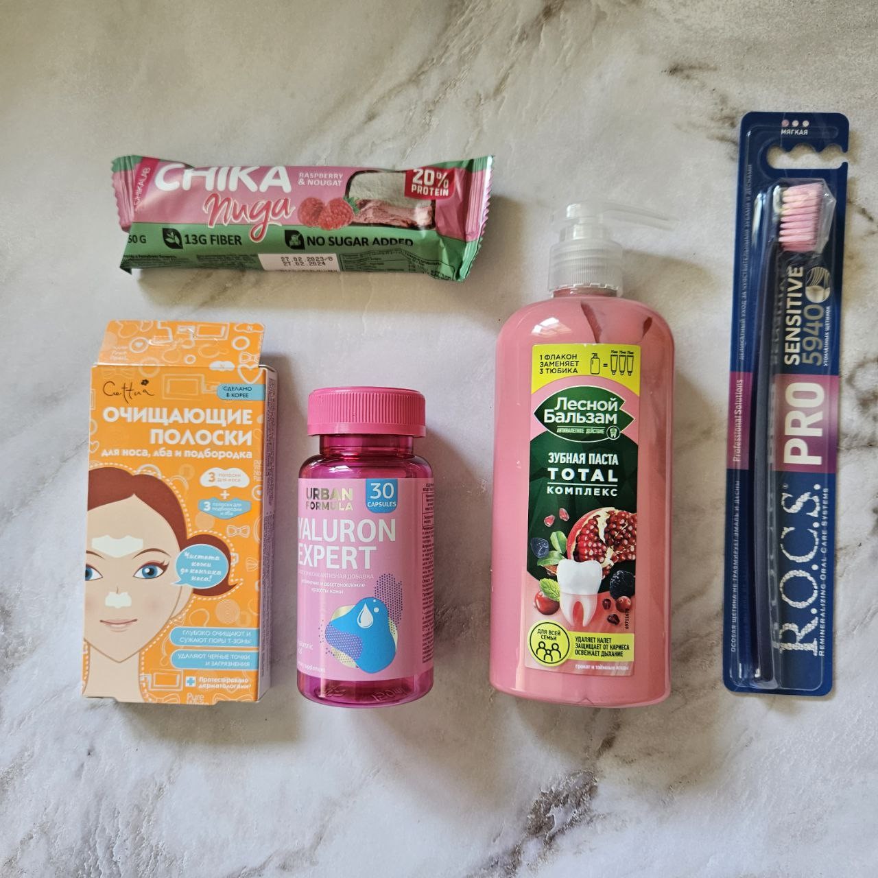 КРЕМ ДЛЯ РУК И НОГТЕЙ Kamill CLASSIC VEGAN С БИОРОМАШКОЙ, БАД URBAN FORMULA «ГИАЛУРОНОВАЯ КИСЛОТА 150 МГ», ОЧИЩАЮЩИЕ ПОЛОСКИ CETTUA ДЛЯ НОСА, ЛБА И ПОДБОРОДКА, ВВ-КРЕМ 10В1 Чистая линия МГНОВЕННОЕ ПРЕОБРАЖЕНИЕ С ЭКСТРАКТОМ РОЗЫ, БАЛЬЗАМ «СПАСАТЕЛЬ», ЗУБНАЯ ПАСТА Лесной бальзам ДЛЯ ВСЕЙ СЕМЬИ КОМПЛЕКС ГРАНАТ И ТАЕЖНЫЕ ЯГОДЫ (кстати, паста оказалась с дозатором, это очень удобно и экономично), БАТОНЧИК CHIKALAB НУГА С МАЛИНОЙ, НЕЗАМЕНИМЫЕ ТКАНЕВЫЕ МАСОЧКИ ДЛЯ ЛИЦА, СКРАБ ДЛЯ ТЕЛА AleVi «КОФЕЙНЫЙ АНТИЦЕЛЛЮЛИТНЫЙ ДЕТОКС-ПИЛИНГ», ЖИДКОЕ КРЕМ-МЫЛО Dove.