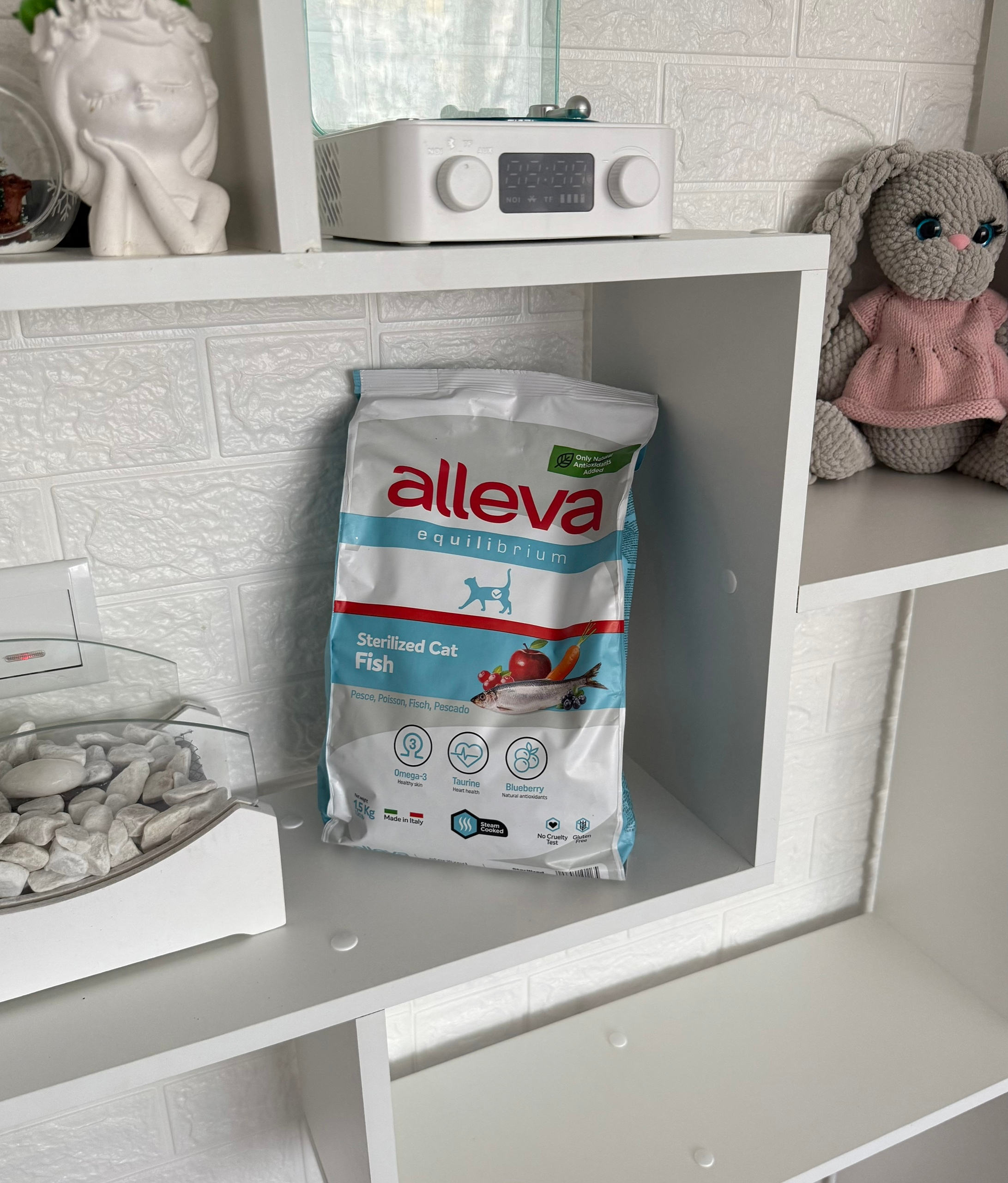 От проекта нам был направлен корм бренда Alleva со вкусом курицы. Весом 1,5 кг. Этот корм произведен в Италии только из натуральных составляющих. Обогащен омегой - 3, таурином и натуральными антиоксидантами. Не содержит глютена.