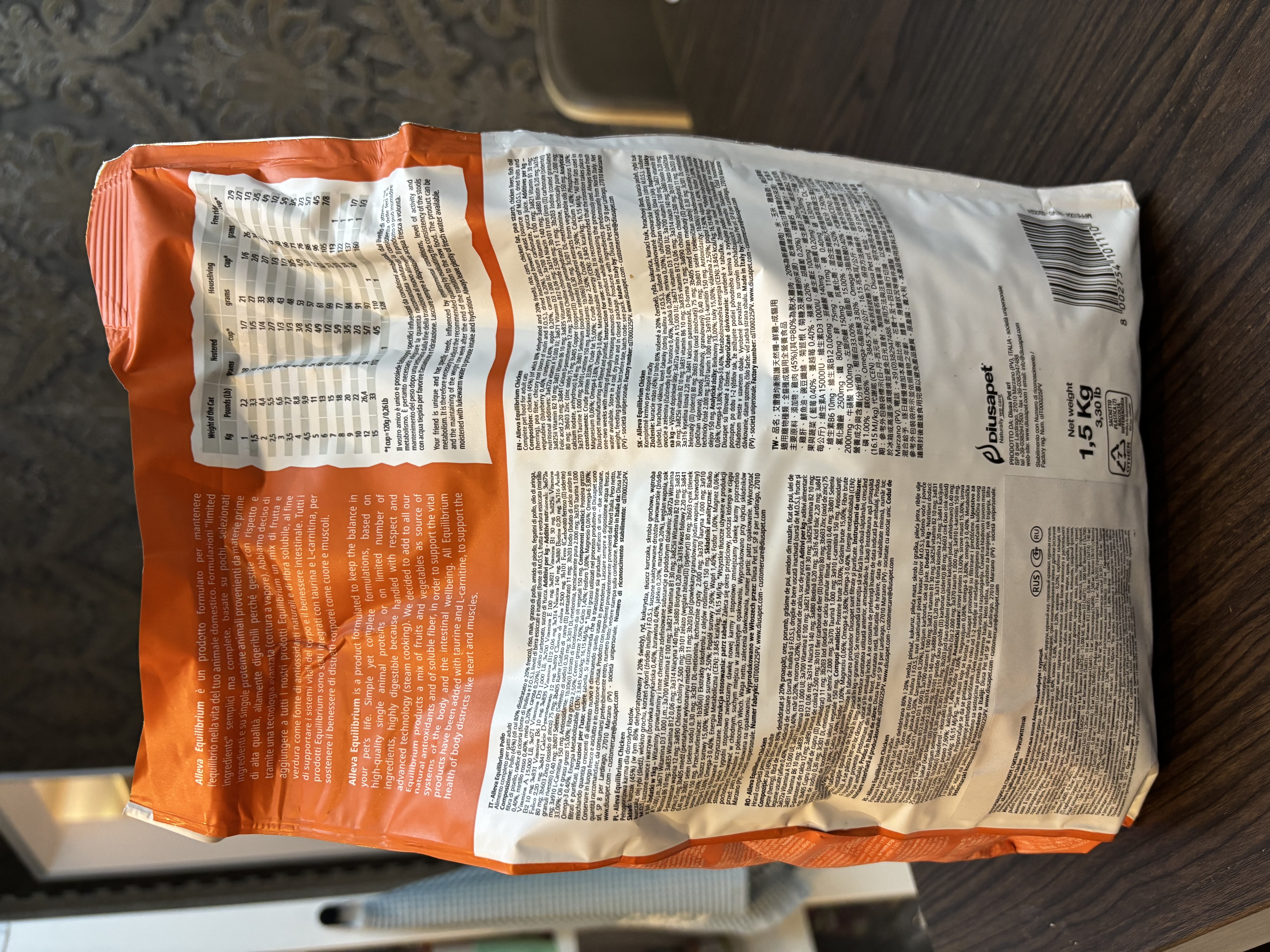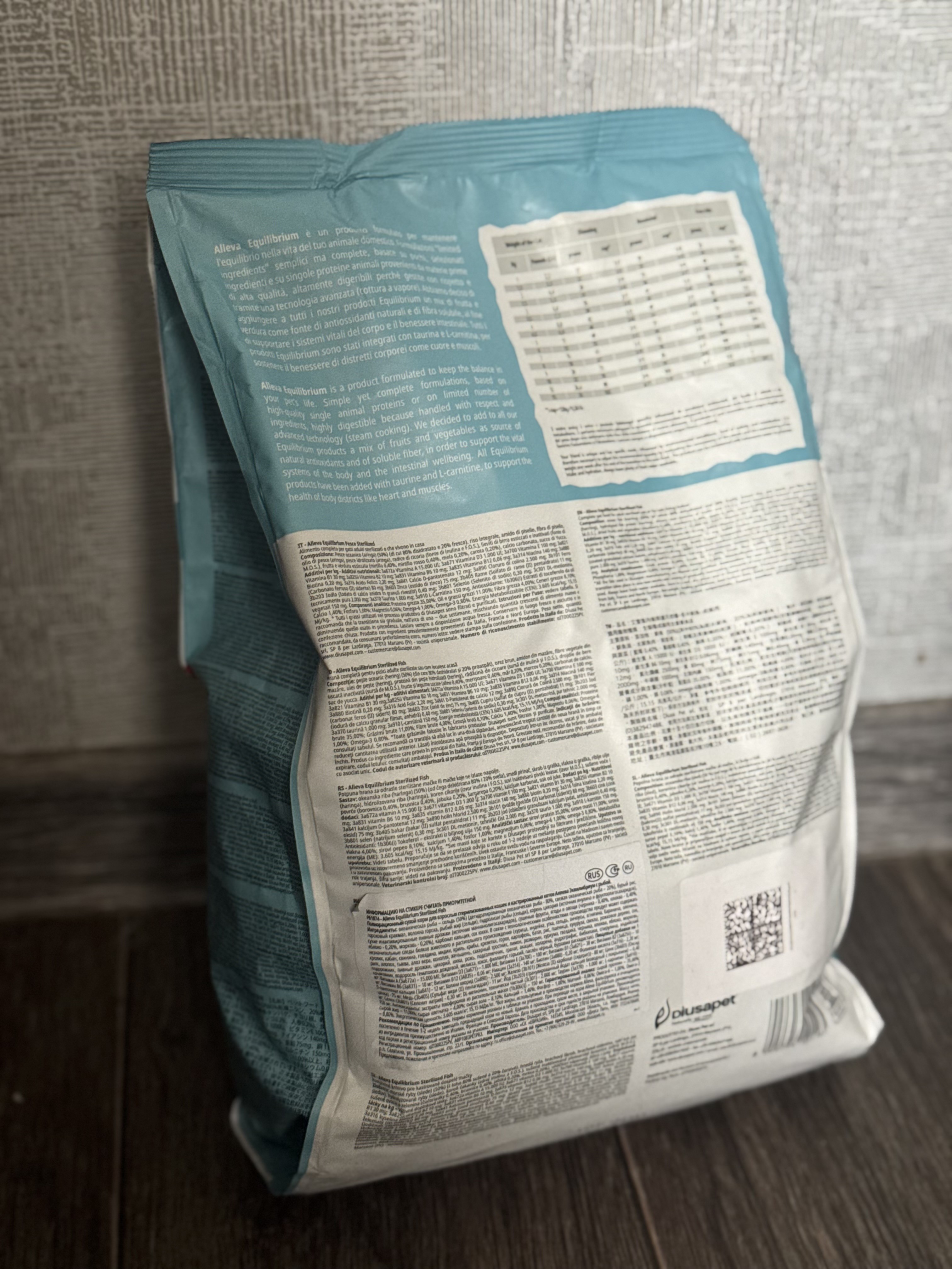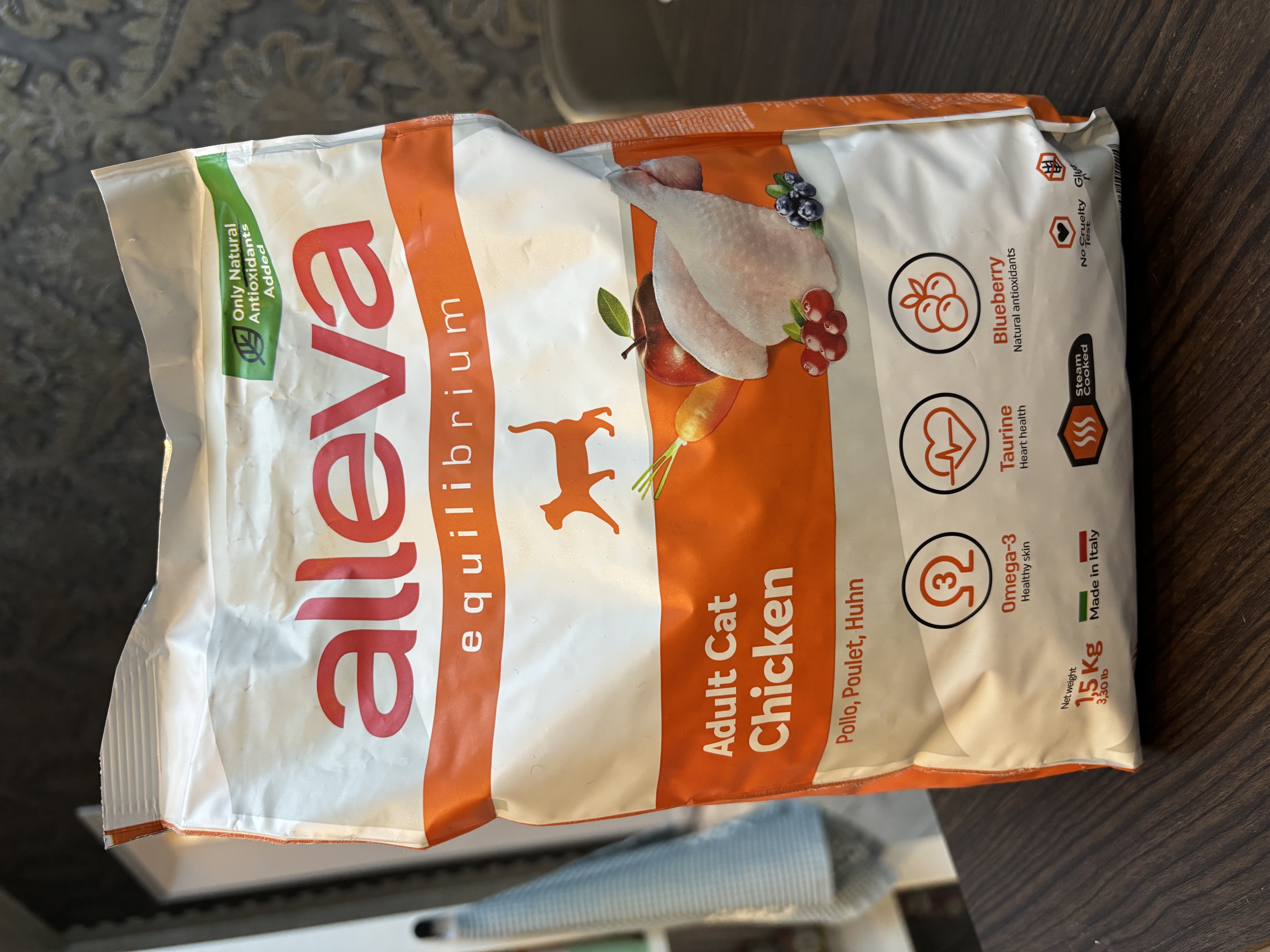 От проекта нам был направлен корм бренда Alleva со вкусом курицы. Весом 1,5 кг. Этот корм произведен в Италии только из натуральных составляющих. Обогащен омегой - 3, таурином и натуральными антиоксидантами. Не содержит глютена.
