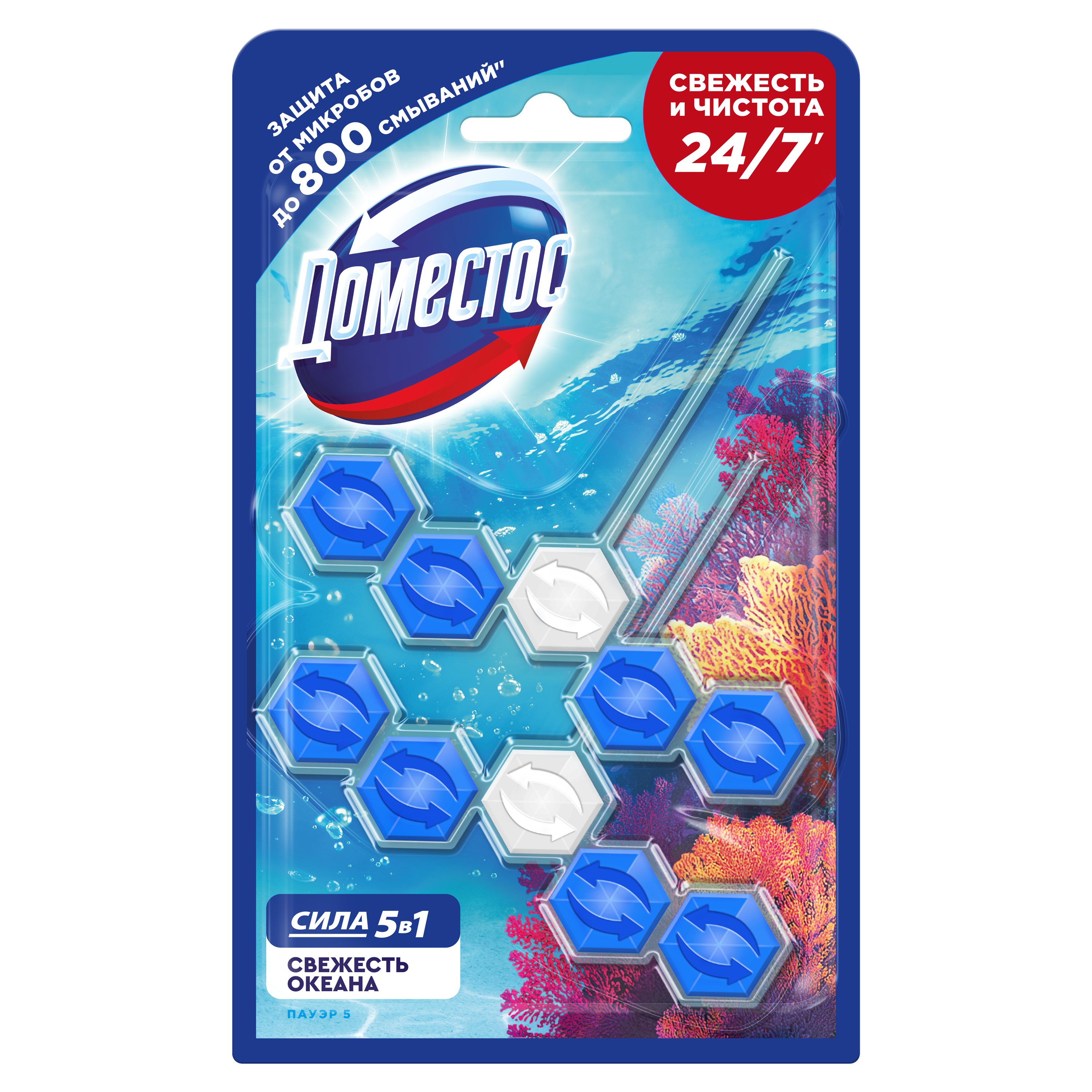 Блок для туалета Доместос Сила 5в1 Антиналет Свежесть океана против известкового налета и неприятного запаха — это пять преимуществ, помогающих обеспечить защиту от загрязнений и микробов и сохранить чистоту и блеск.