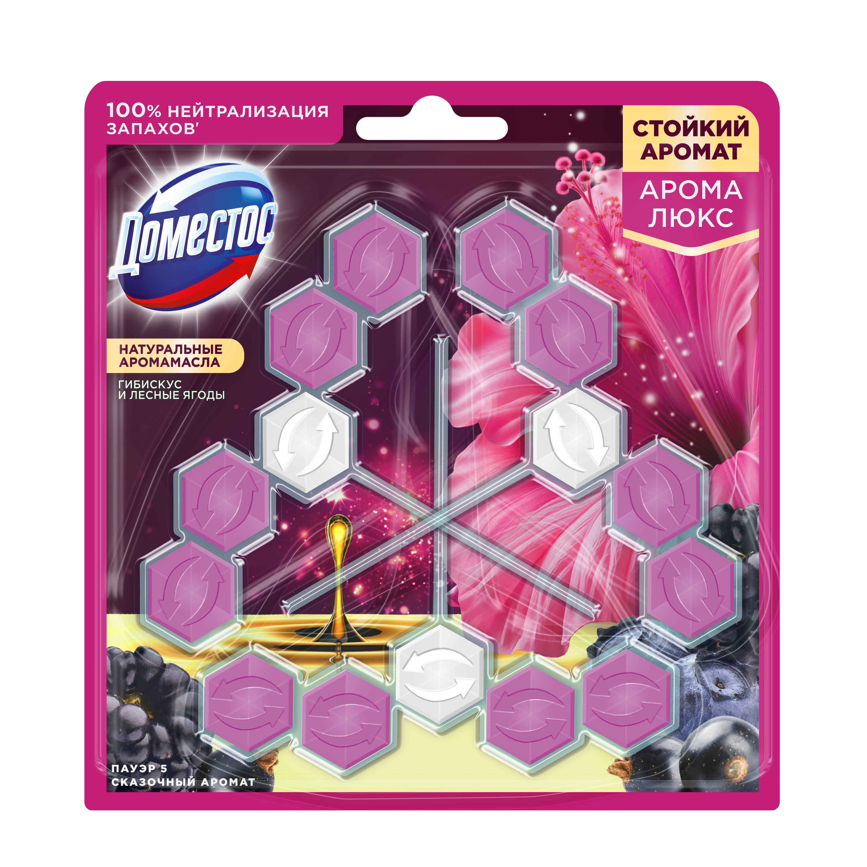 При каждом смывании появляется свежий аромат пряного гибискуса и сочных лесных ягод на срок 24 часа* и обильная пена, которая борется с налетом, поддерживая гигиену и блеск поверхности унитаза. С новыми ароматами от Доместос можно наслаждаться приятными и яркими ароматами цветов, фруктов и ягод не выходя из дома. Блок Доместос для унитаза содержит активное вещество, которое под действием напора воды ополаскивает всю поверхность унитаза, защищая от бактерий и помогая предотвращать известковый налет. Блок для туалета Доместос Арома Люкс Сказочный аромат: