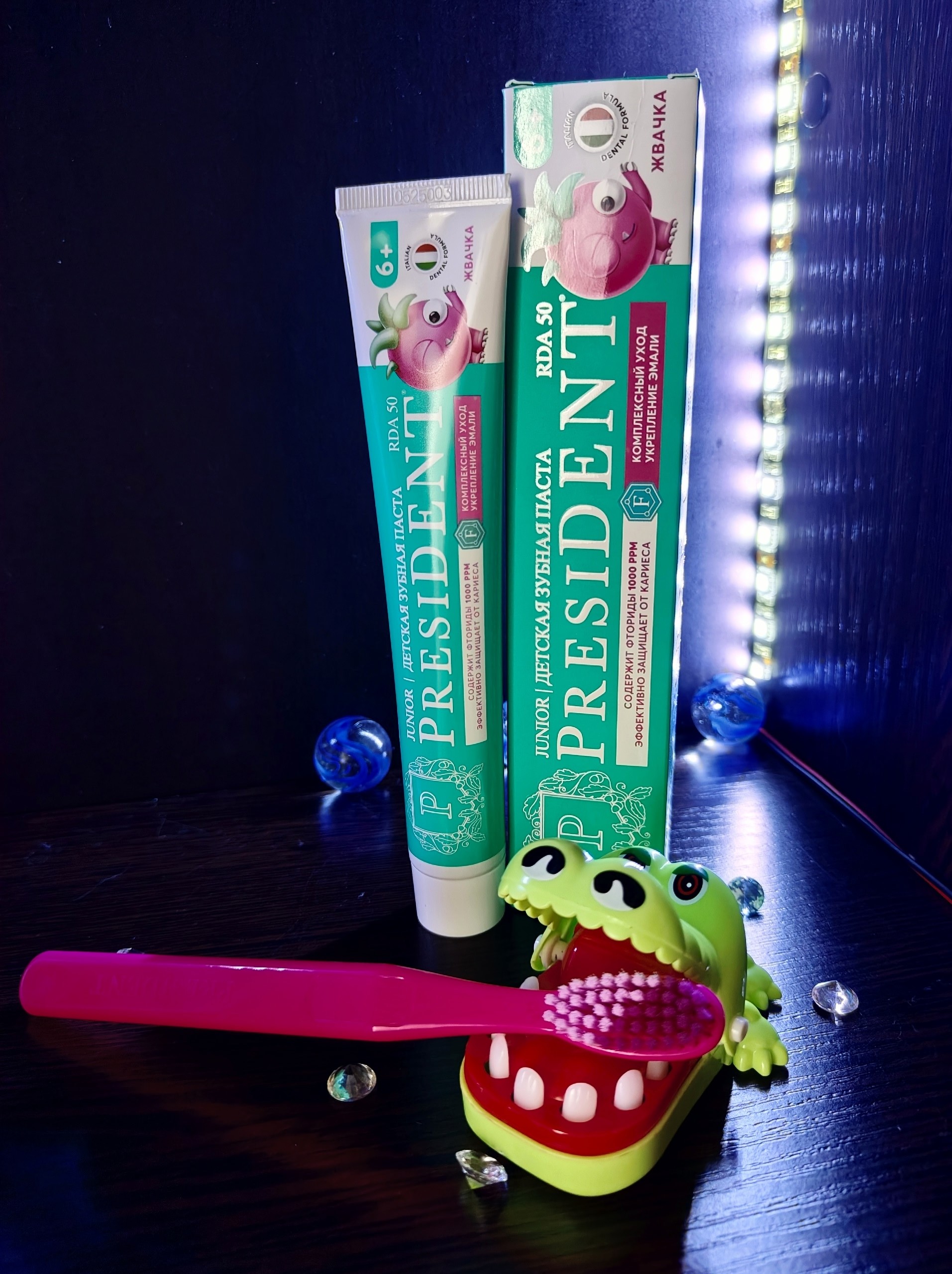 Детская зубная паста «Жвачка 6+» от «PRESIDENT» помогает предотвратить кариес, укрепляет эмаль, чистит зубы и заботится о деснах. В ней есть полезные компоненты, она одобрена детскими стоматологами и прошла тесты. В пасте нет абразивов, вредных ПАВ и сахара.