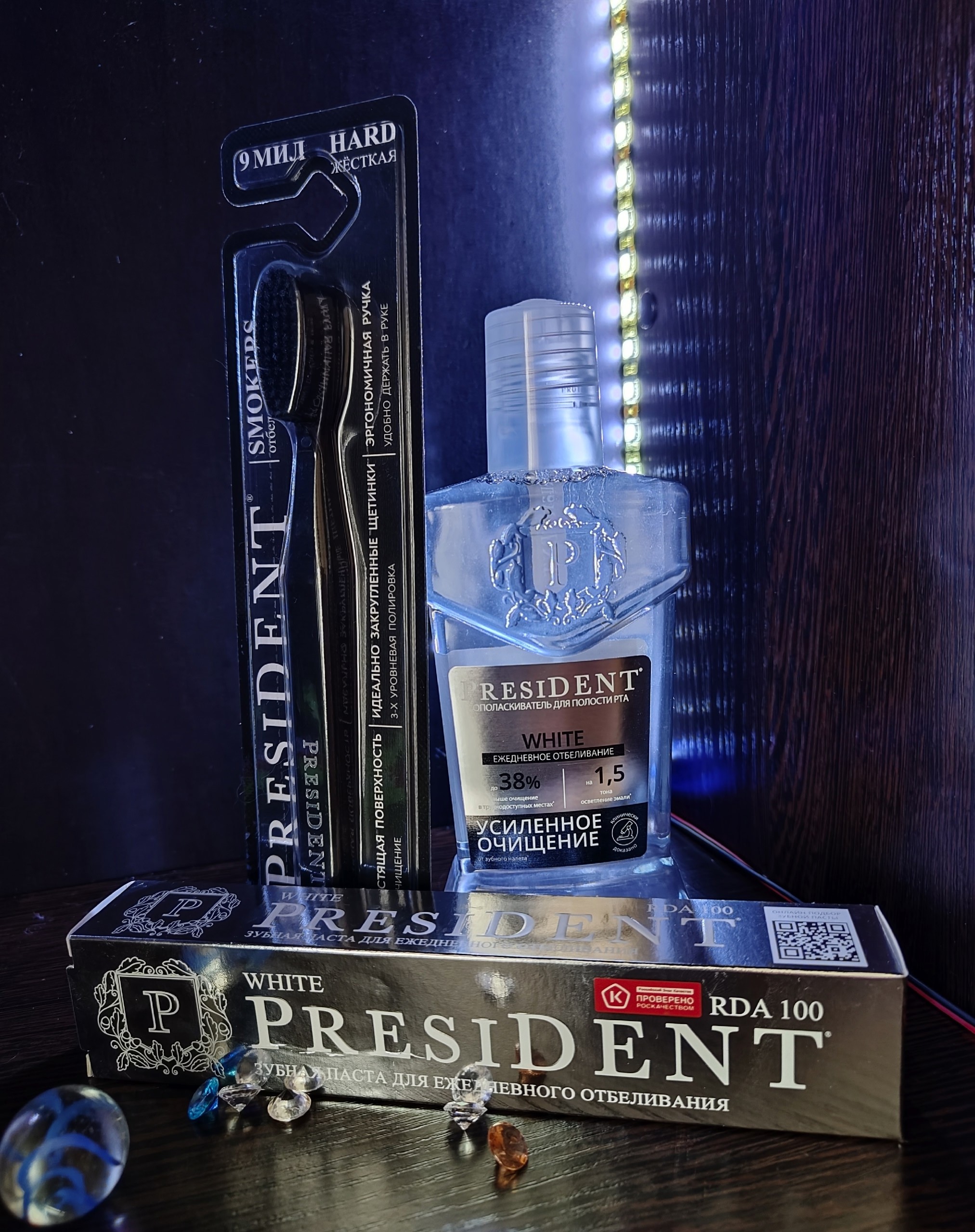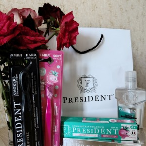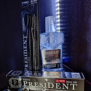 Весь товар был упакован с фирменный пакет. В составе была паста President White RDA 100, ополаскиватель для полости рта "President" White усиленное очищение, зубная щетка President Smokers, а также наборчик для моей старшей дочки зубная паста и щетка для детей.