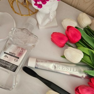 2. Отбеливающий ополаскиватель President White. Очень нужная вещь. Помогает освежить дыхание в течение дня, а также бережно отбеливает зубы, имеет приятный мятный вкус.