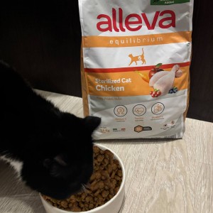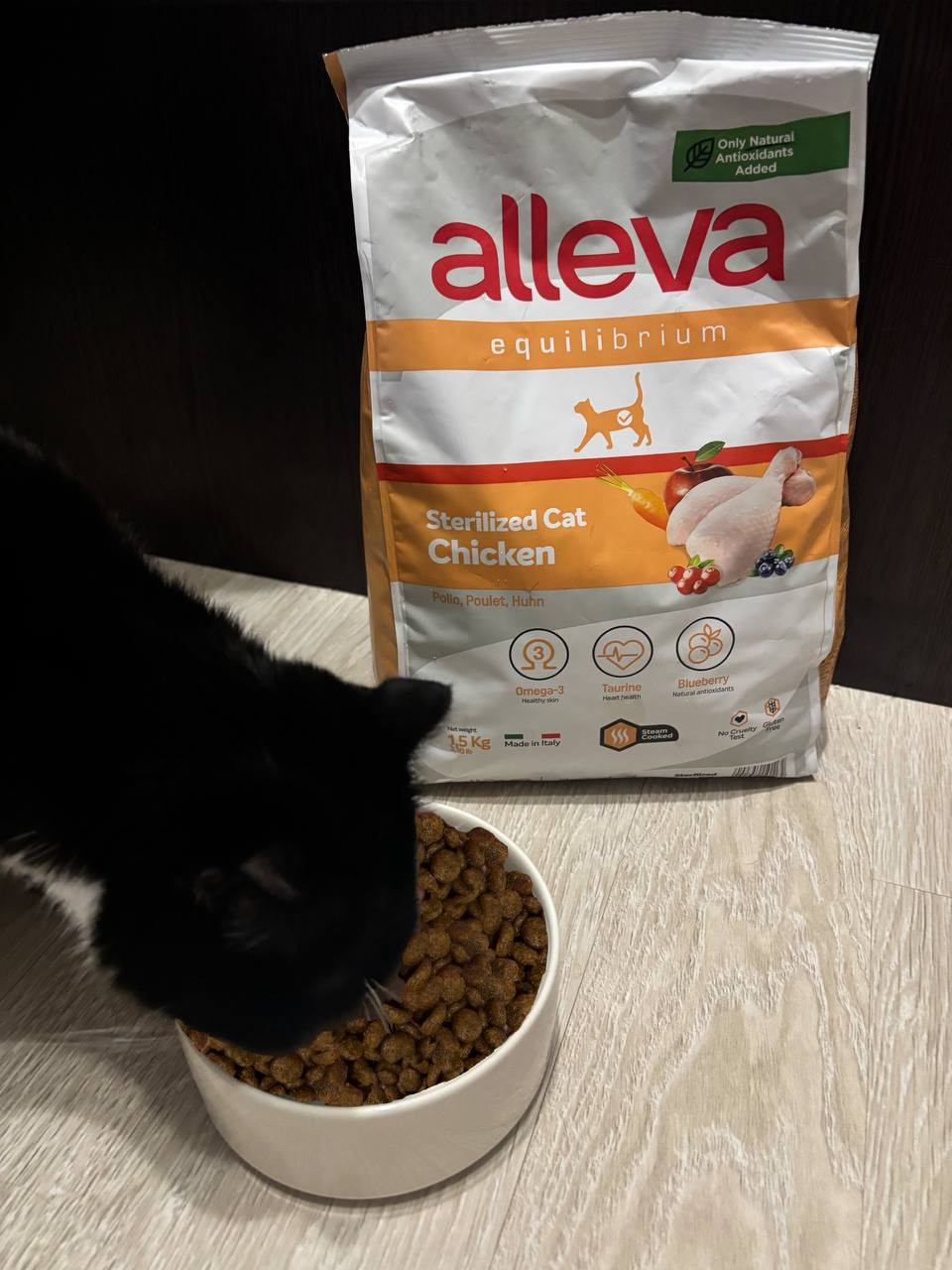 Главная дегустаторша — Марго, ей полтора года, стерилизована, энергична и "с характером". Если ей не нравится корм, она даже не подходит к миске, поэтому каждый новый рацион — как маленькое испытание. Но Alleva её приятно удивил: Марго сама подошла, понюхала, и буквально сразу начала хрустеть. Вводили постепенно — пищеварение отреагировало спокойно.