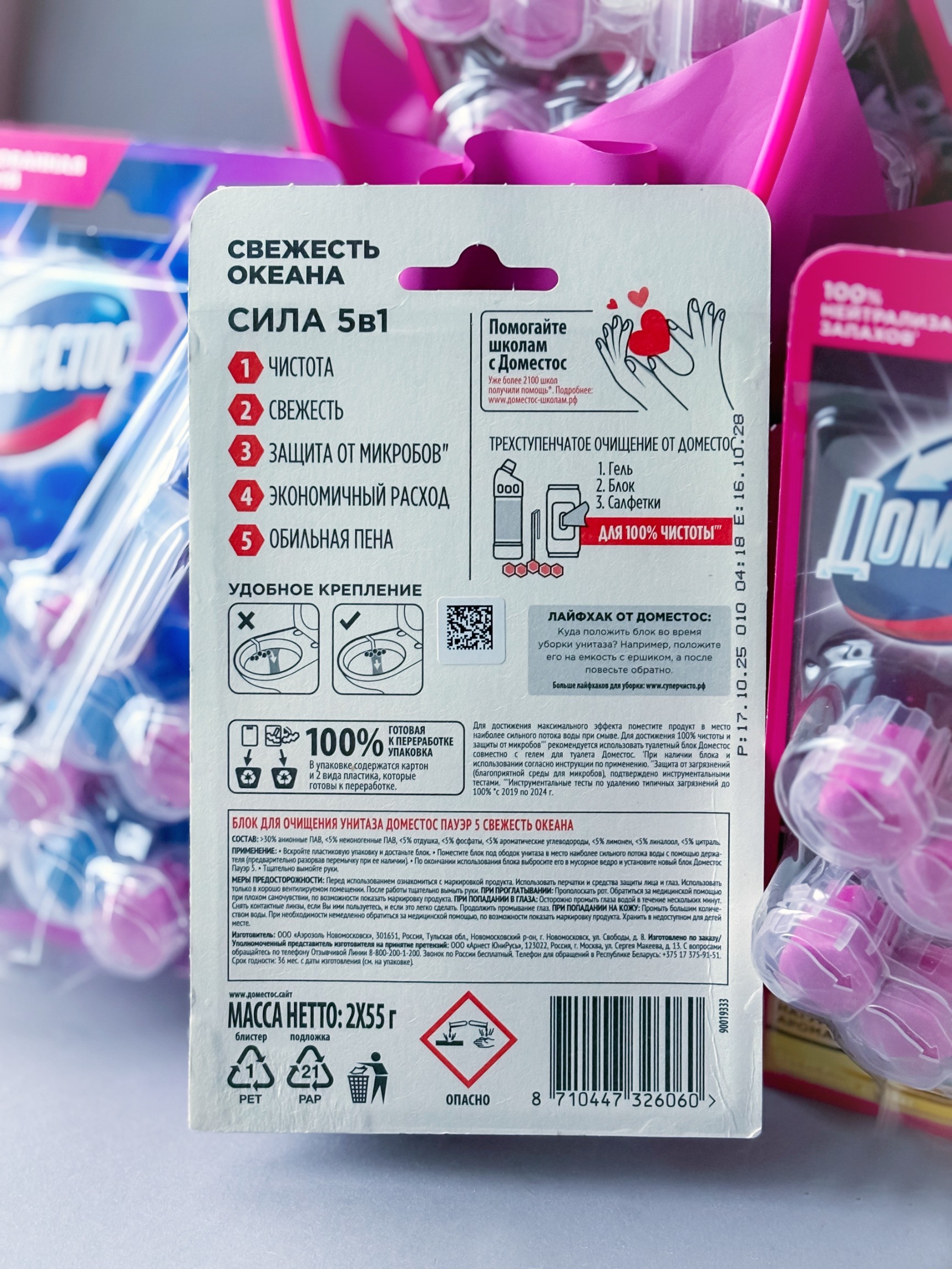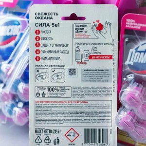 💦 Туалетный блок Domestos "Сила 5в1 Свежесть океана" – это просто находка для тех, кто ценит чистоту и свежесть в туалете. Упаковка из двух блоков по 110 грамм – отличное решение, хватает надолго.