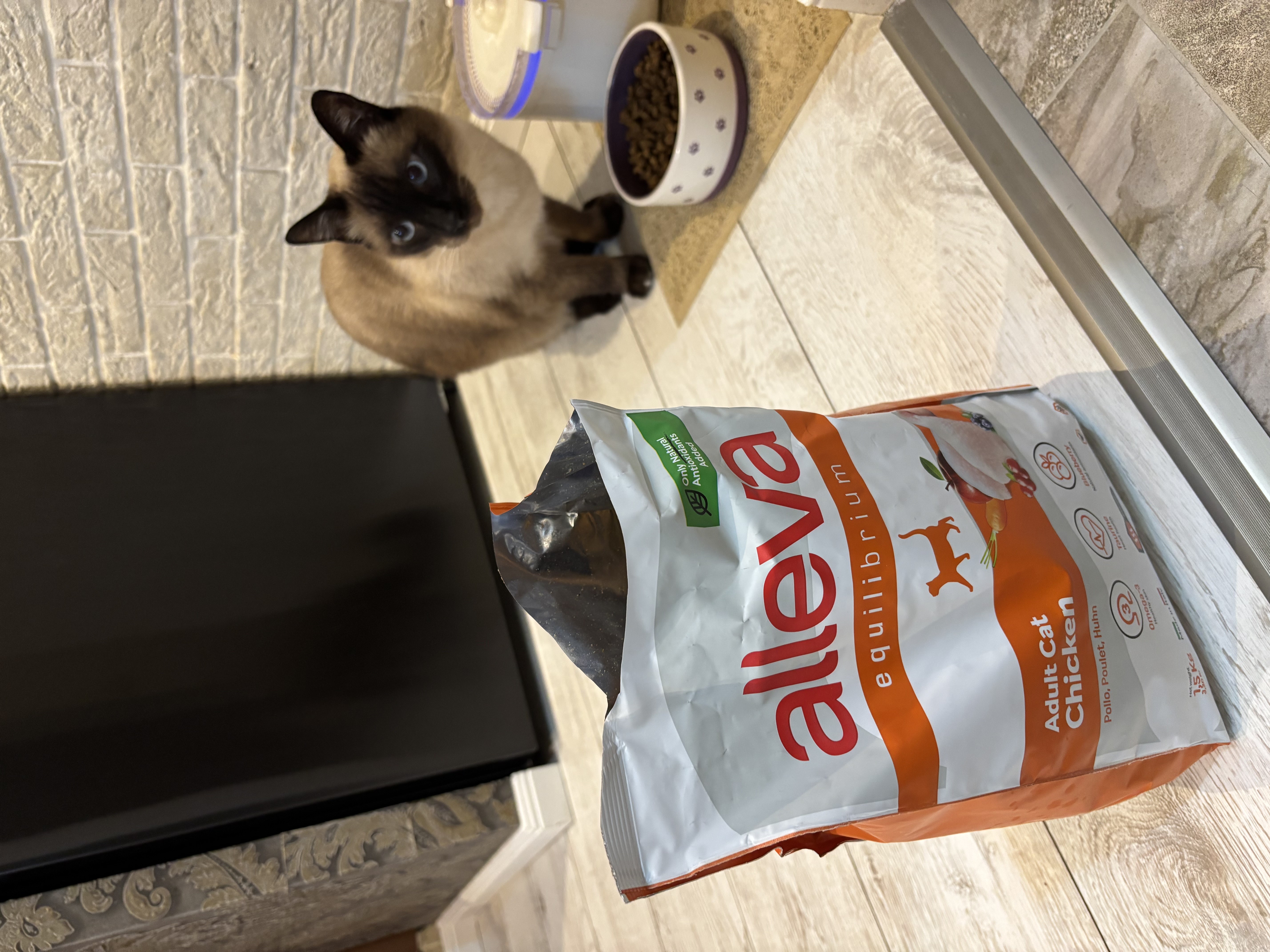 От проекта нам был направлен корм бренда Alleva со вкусом курицы. Весом 1,5 кг. Этот корм произведен в Италии только из натуральных составляющих. Обогащен омегой - 3, таурином и натуральными антиоксидантами. Не содержит глютена.