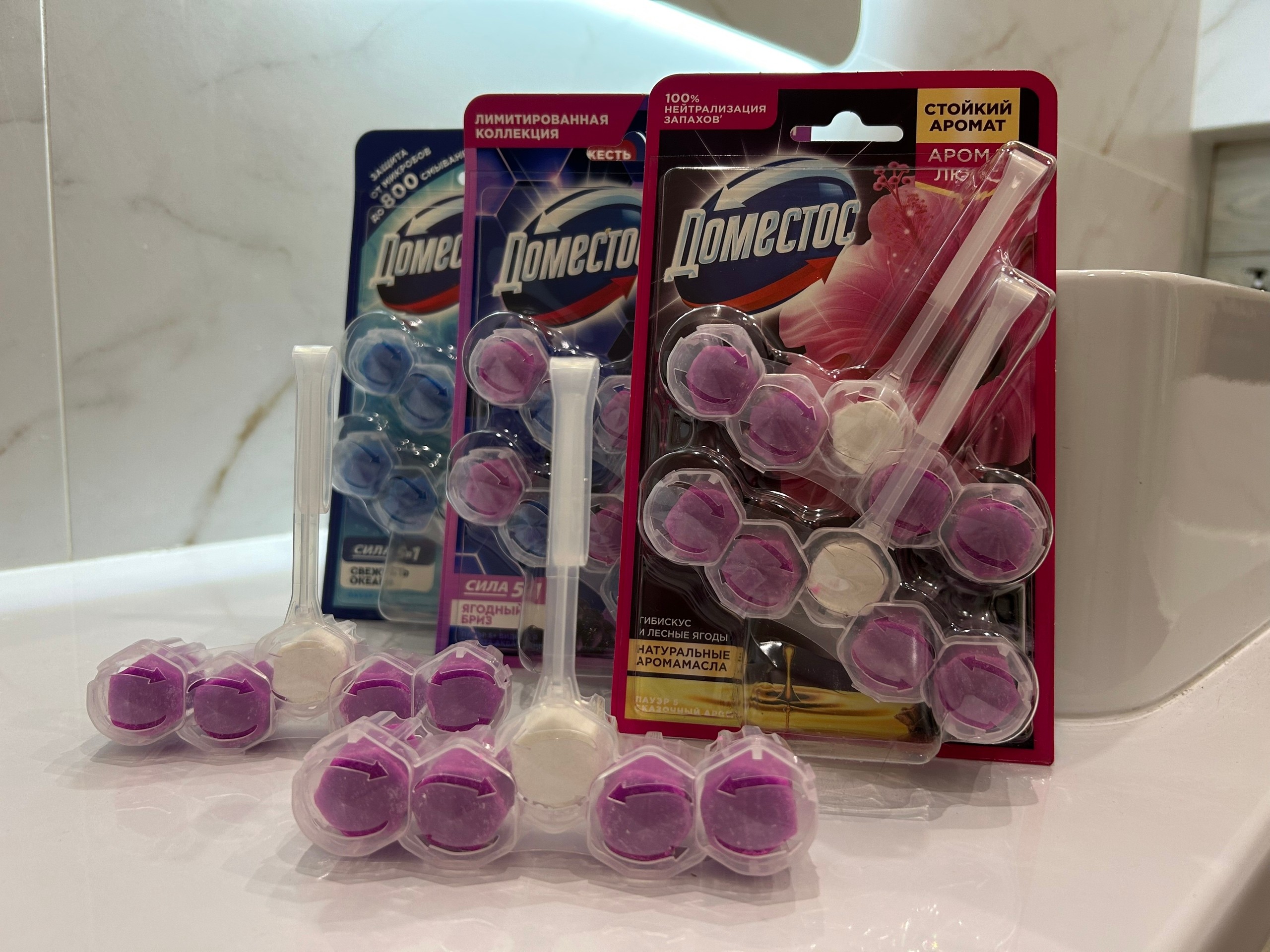 🚽 Особенно меня впечатляют туалетные блоки. У них очень яркие ароматы, эффективные составы и они устраняют все вышеперечисленные проблемы. Мои фавориты в ароматах : Свежесть океана, Гибискус и лесные ягоды и Ягодный бриз.
